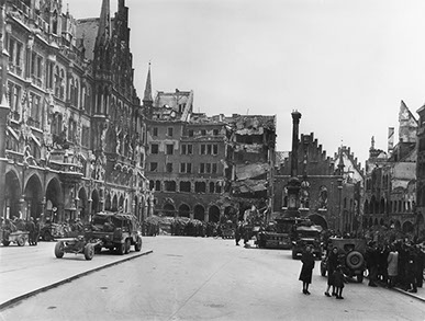 Am 30. April 1945 gegen Nachmittag erreichen die ersten amerikanischen Soldaten den Marienplatz. München nach den Einmarsch der Amerikaner, die Stadt liegt in Trümmern.